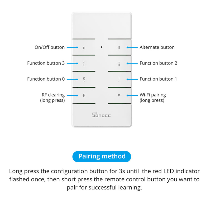 Το remote controller RM433R2 διαθέτει 8 πλήκτρα για εκτέλεση διάφορων εργασιών, σε διαφορετικού τύπου συσκευές. Έχει κομψή, μίνιμαλ εμφάνιση και μεγάλη συμβατότητα, καθώς μπορεί να συνδεθεί πληθώρα συσκευών της Sonoff όπως RFR2, RFR3, Slampher R2, iFan03, D1, 4CHProR3, TX series,...