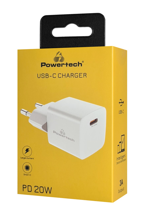 Υψηλής απόδοσης φορτιστής τοίχου της Powertech, κατασκευασμένος από ανθεκτικό υλικό και συμβατός με συσκευές που φορτίζουν μέσω θύρας USB-C. Διαθέτει 1x USB-C θύρα εξόδου που υποστηρίζει φόρτιση με απόδοση έως 20W.