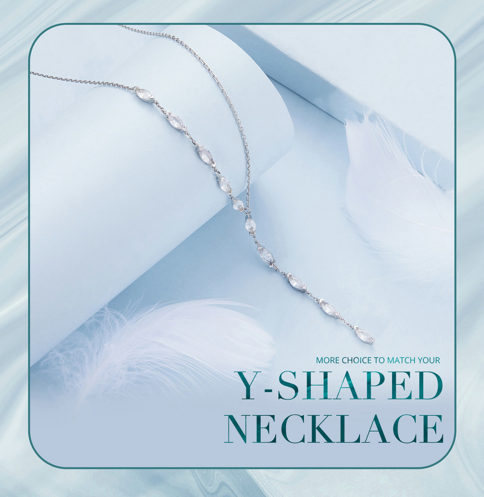 Εντυπωσιακό κολιέ σχήματος Y, σε ασημί χρώμα, διακοσμημένο με κυβική ζιρκόνια, λευκού χρώματος που προσφέρει εξαιρετική λάμψη στο κόσμημα.