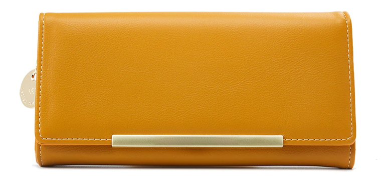 Κομψό, υψηλής ποιότητας γυναικείο πορτοφόλι σε κίτρινο χρώμα με χρυσές λεπτομέρειες. Διαθέτει πολλαπλές θέσεις στο εσωτερικό του για χαρτονομίσματα, 2 μέρη με φερμουάρ για ψιλά και 14 θέσεις για κάρτες.