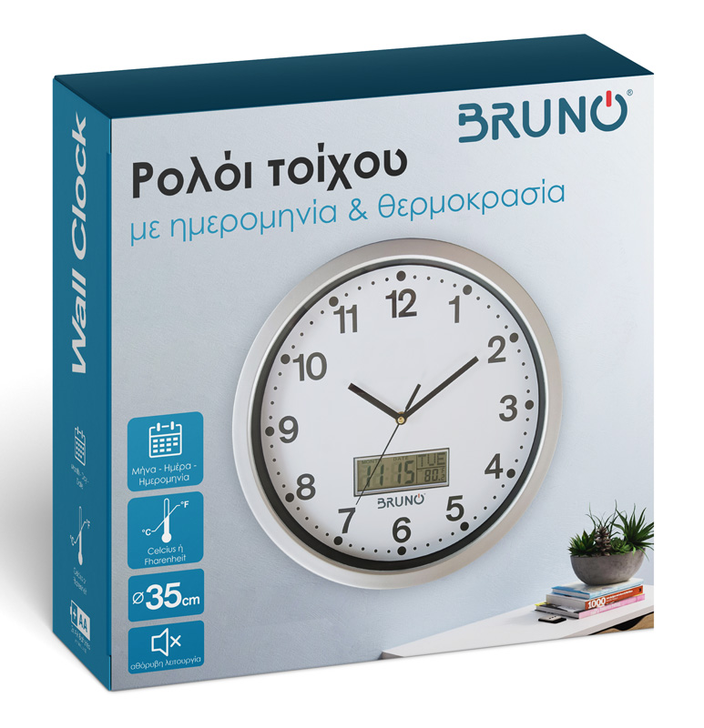 Ρολόι τοίχου από την Bruno με μοντέρνο σχεδιασμό και αθόρυβη λειτουργία. Εξοπλίζεται με ψηφιακή οθόνη για την ένδειξη της ημερομηνίας (μήνας, ημέρα) και της θερμοκρασίας. Η τροφοδοσία του γίνεται με 2x AA μπαταρίες οι οποίες δεν συμπεριλαμβάνονται στην συσκευασία.