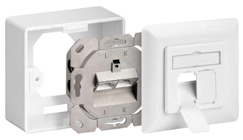 Επιτοίχια πρίζα με 2 θύρες δικτύου για σύνδεση καλωδίων με βύσμα RJ45. Είναι θωρακισμένη, ικανή για ταχύτητες 10 GBit Ethernet και ιδανική για χρήση PoE+ IEEE 802.3at.