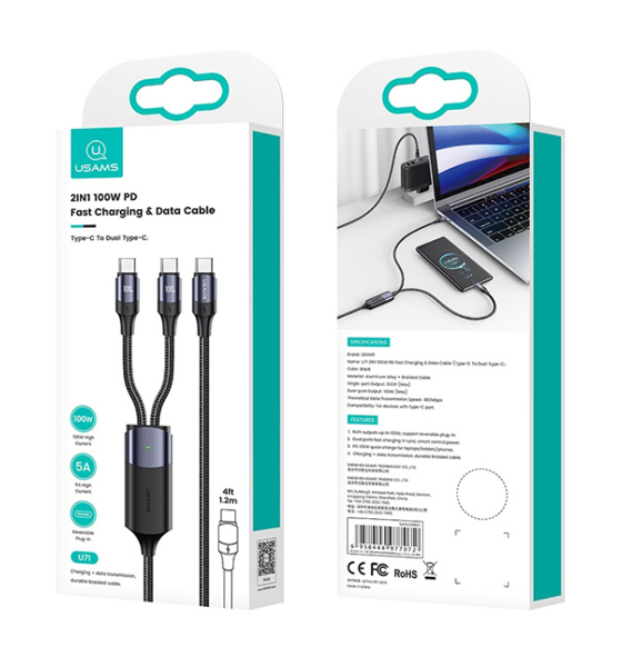 Καλώδιο φόρτισης και μεταφοράς δεδομένων USB-C σε 2x USB-C της Usams, με απόδοση φόρτισης έως 100W.