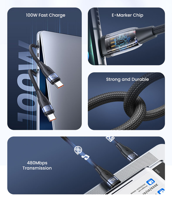 Καλώδιο φόρτισης και μεταφοράς δεδομένων USB-C σε USB-C της Usams. Υποστηρίζει φόρτιση με απόδοση έως 100W και μεταφορά δεδομένων με ταχύτητα έως 480Mbps.