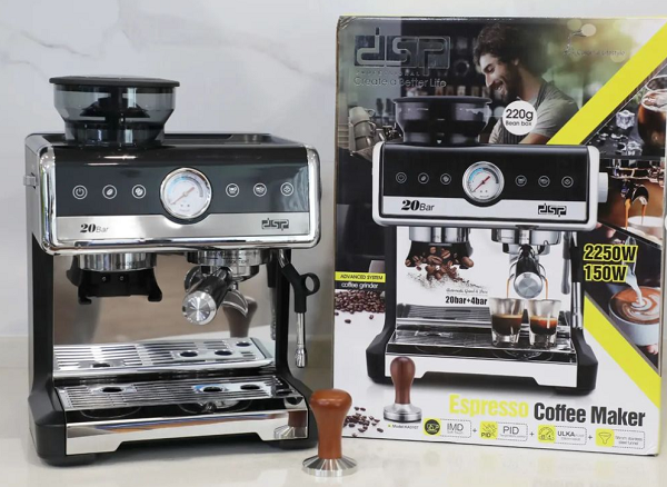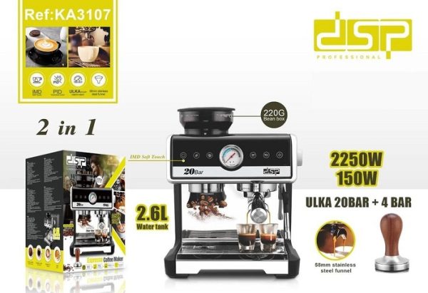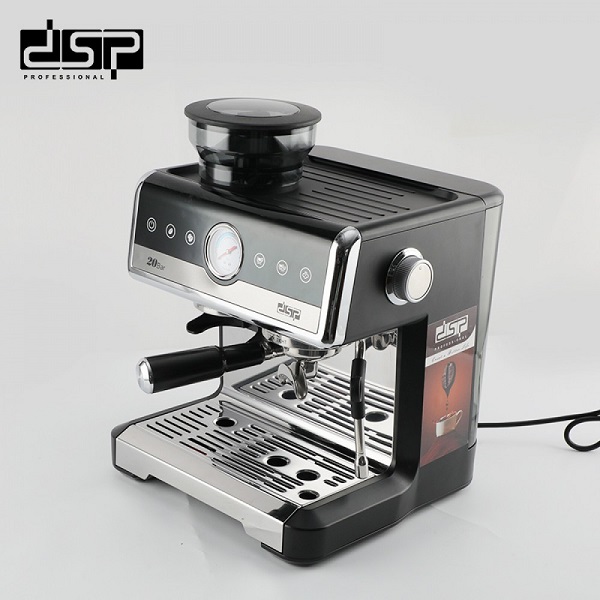 Μηχανή καφέ Espresso της DSP 2 σε 1 με ενσωματωμένο μύλο άλεσης. Υψηλής ποιότητας κατασκευή και απόδοση, ιδανική για επαγγελματικό καφέ espresso και ροφήματα στο σπίτι σας. Με ατσάλινο κλείστρο και ακροφύσιο αέρα από όπου μπορείτε να φτιάξετε εύκολα ζεστό αφρόγαλα, ζεστή σοκολάτα ή να ζεστάνετε άμεσα γάλα και ροφήματα.