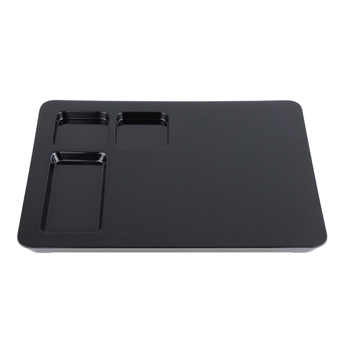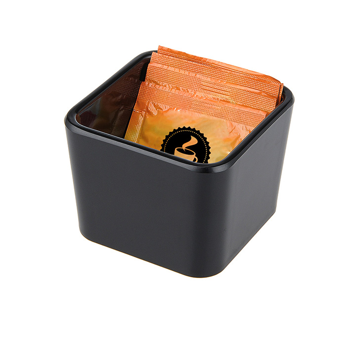 Αποτελείται από κομψό δίσκο μελαμίνης διαστάσεων 380x280x20mm, με μοντέρνο design από μελαμίνη με μαύρη γυαλιστερή επιφάνεια, μία σταθερή θήκη για φακελάκια ζάχαρης/καφέ και δύο πρακτικές αποσπώμενες θήκες για φακελάκια καφέ / τσάι και κουταλιών.