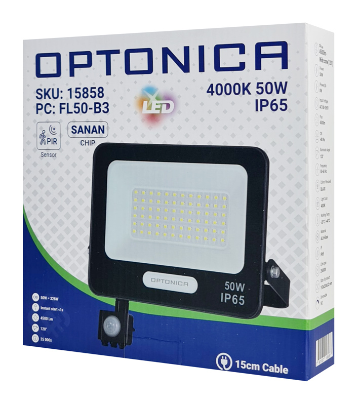 LED προβολέας της Optonica, με ισχύ 50W και αισθητήρα κίνησης PIR με οπτικό πεδίο ανίχνευσης 120°. Διαθέτει μεταλλικό περίβλημα με στεγανοποίηση επιπέδου IP65 και είναι κατάλληλος για χρήση σε εξωτερικούς χώρους.