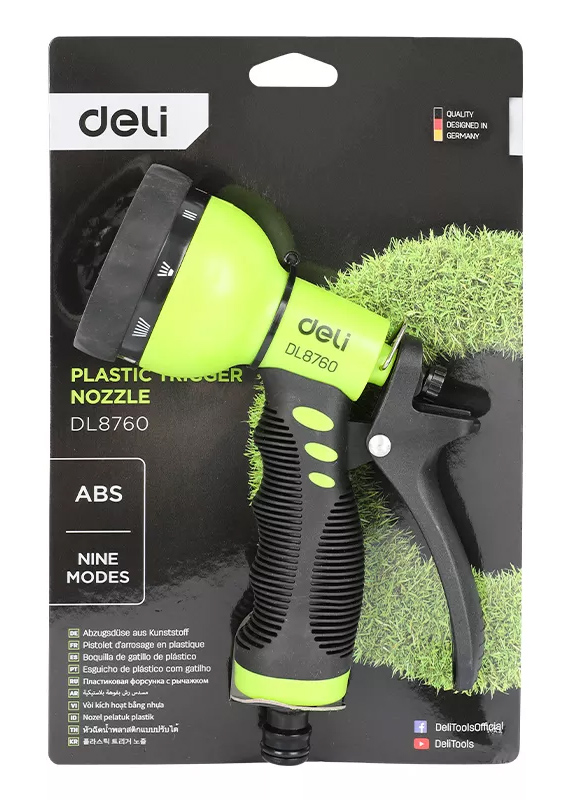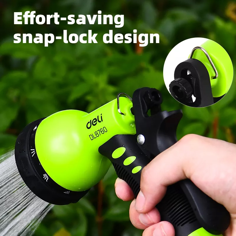 Πιστόλι εκτόξευσης νερού της Deli με 9 λειτουργίες ψεκασμού. Διαθέτει αντιολισθητική λαβή που εφαρμόζει καλά στο χέρι για πιο ξεκούραστο πότισμα.