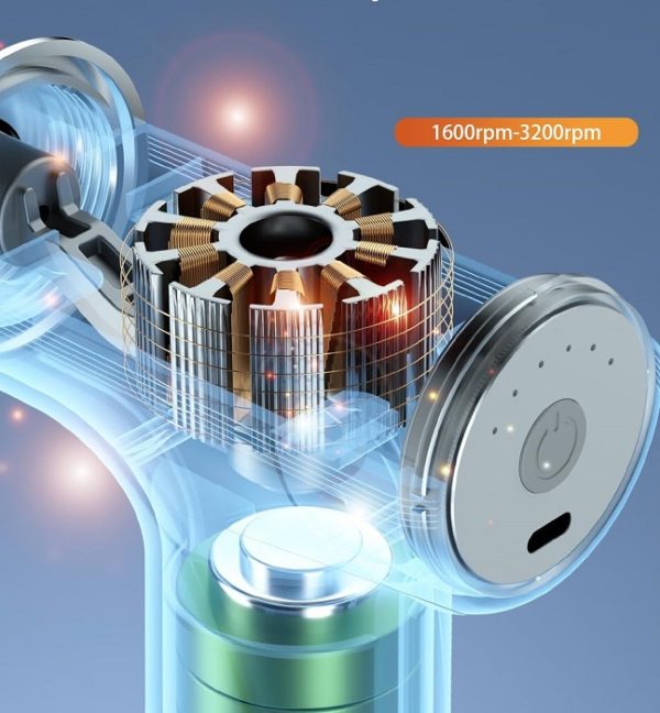 Διείσδυση στους μύες σε βάθος έως 5mm, Ισχύς: 24W Max, Επαναφορτιζόμενη μπαταρία 2400mah (περιλαμβάνεται καλώδιο φόρτισης), 6 ταχύτητες (1600rpm – 3200rpm), 4 εναλλασσόμενες κεφαλές για ευρεία εφαρμογή σε όλο το σώμα. Αυτονομία έως 40′ (σε χαμηλή ένταση). Διαστάσεις συνολικές: 12 x 16 x 4cm. Μήκος λαβής: 9cm.