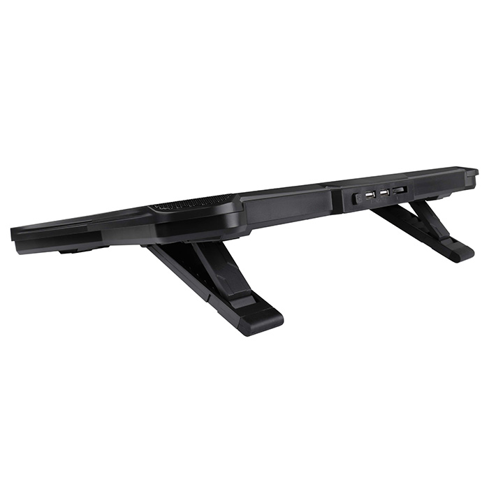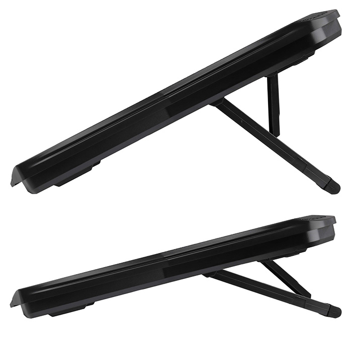 Στο κάτω μέρος έχει ένα αποσπώμενο κομμάτι το οποίο κουμπώνει κάθετα στην επιφάνεια τοποθέτησης του laptop, ούτως ώστε να το σταθεροποιεί όταν έχετε επιλέξει την μέγιστη κλίση στο notebook cooler.