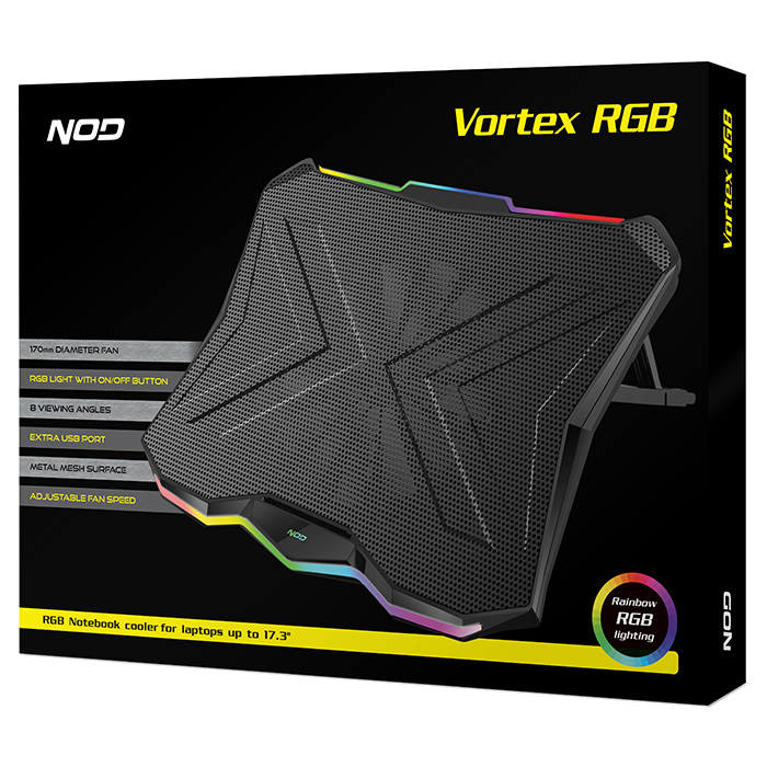 Το NOD VORTEX RGB θα προσφέρει την απαραίτητη ψύξη στο laptop σας χάρη στον μεγάλο και αθόρυβο ανεμιστήρα 170mm που διαθέτει! Είναι κατάλληλο για laptop με διαγώνιο έως και 17.3", ενώ διαθέτει ρυθμιζόμενη κλίση 8 επιπέδων για να το ρυθμίζετε στην κατάλληλη γωνία που σας βολεύει, είτε εργάζεστε είτε είστε φανατικός gamer.