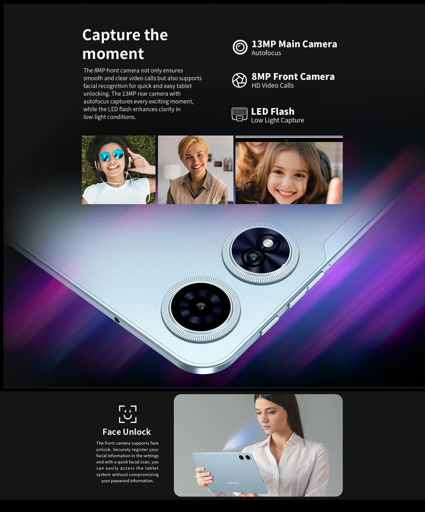 Με υποστήριξη διπλής κάρτα SIM και δικτύου 4G, το tablet T60 Plus σας επιτρέπει να παραμείνετε συνδεδεμένοι όπου κι αν βρίσκεστε. Επιπλέον, η τεχνολογία WiFi σας εξασφαλίζει γρήγορη και αξιόπιστη ασύρματη σύνδεση.