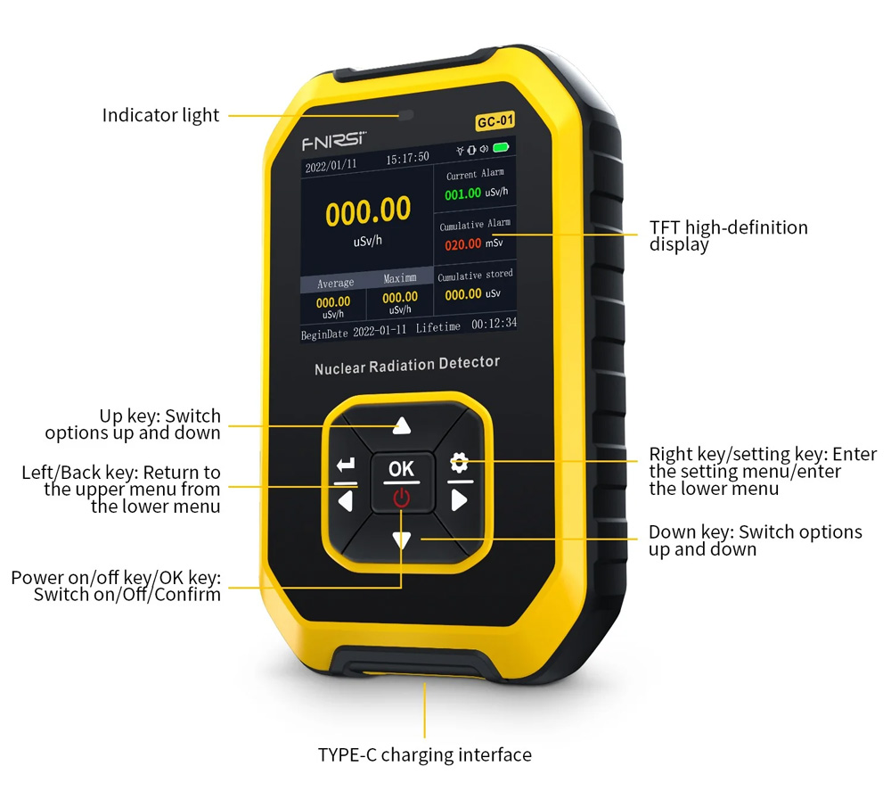 FNIRSI ψηφιακός μετρητής ακτινοβολίας GC-01, β/γ/Χ ακτίνες, επαναφορτιζόμενος