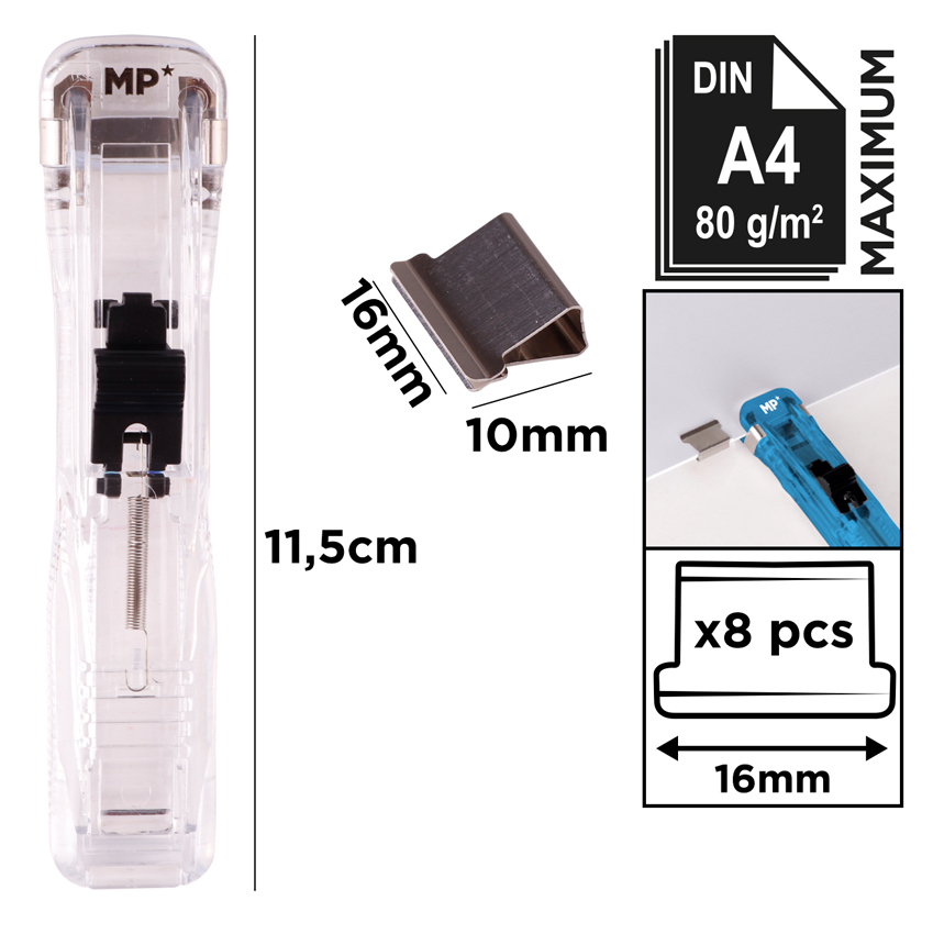 MP συρραπτικό τύπου κλιπ PA109 με 8x επαναχρησιμοποιήσιμα κλιπ, 45 φύλλα, διάφανο