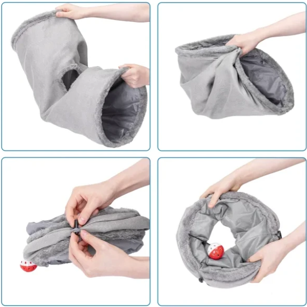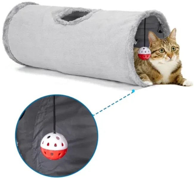 Μια ευχάριστη, πτυσσόμενη σήραγγα γάτας που συνοδεύεται από μια κρεμαστή μπάλα.