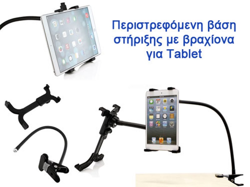 Περιστρεφόμενη βάση στήριξης με βραχίονα για tablet με εργονομική σχεδίαση και βάση για το γραφείο - σπίτι εως 24cmΕπιστρέφετε στο σπίτι σας κουρασμένος και θέλετε να δείτε μια ταινία στο tablet σας αλλα θέλετε να έχετε και τα χέρια σας ελέυθερα; Με την μεταλλική περιστρεφόμενη βάση στήριξης με βραχίονα μπορείτε να το πραγματοποιήσετε. Άνεση εγκατάστασης και προσαρμογής σε οποιοδήποτε σημείο, όπως την άκρη του κομοδίνου, την άκρη του γραφείου. Απολαύστε την αγαπημένη σας ταινία, ακούστε την αγαπημένη σας μουσική χωρίς να έχετε δεσμευμένα τα χέρια σας ενώ παράλληλα μπορείτε να κάνετε άλλες δουλειές. Με συνολικό μήκος 65cm μπορείτε να προσαρμόσετε στο ύψος που εσείς θέλετε το tablet σας και να παρακολουθήσετε ξεκούραστα το Multimedia υλικό που εσείς επιθυμείτε.Η βάση στήριξης με βραχίονα είναι στιβαρής μεταλλικής κατασκευής. Είναι κατάλληλη για συσκευές διαστάσεων 12 εως 24cm. Επίσης έχει την δυνατότητα να περιστρέφεται κατά 360 μοίρες έτσι ώστε να στηρίξετε την συσκευή σας τόσο σε οριζόντια όσο και σε κατακόρυφη θέση. Χαρακτηριστικά:Στιβαρός μεταλλικός βραχίοναςΠεριστρεφόμενη Βάση 360 μοίρεςΚλιπ στερέωσης για το γραφείοΜαύρο ΧρώμαΜήκος βραχίονα 65 cmΔέχεται Tablet από 12 έως 24cm πλάτος