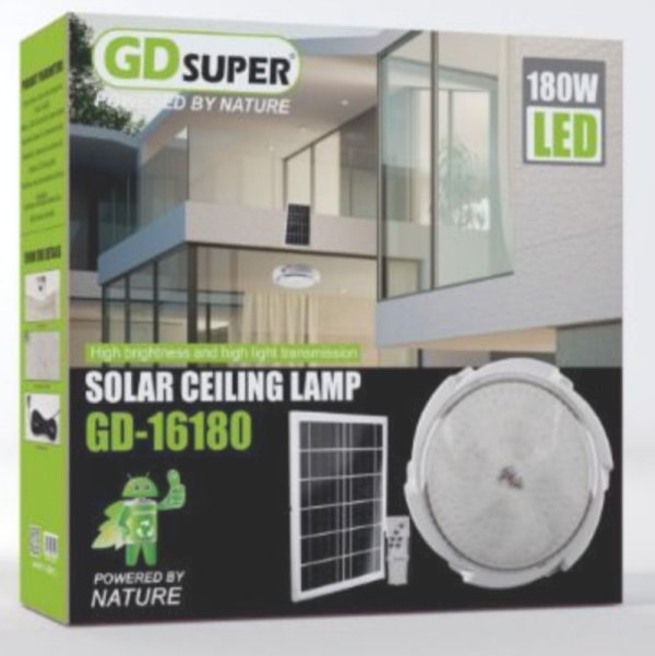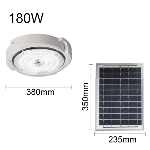 Η συσκευασία περιλαμβάνει: 1 x 180W ηλιακό φωτιστικό οροφής, 1 x ηλιακό πάνελ, 1 x σακούλα βίδες στερέωσης, 1 x τηλεχειριστήριο.
