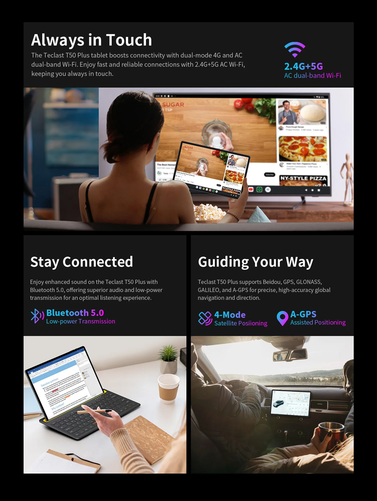 Με υποστήριξη διπλής κάρτα SIM και δικτύου 4G, το tablet T50 Plus σας επιτρέπει να παραμείνετε συνδεδεμένοι όπου κι αν βρίσκεστε. Επιπλέον, η τεχνολογία WiFi σας εξασφαλίζει γρήγορη και αξιόπιστη ασύρματη σύνδεση.