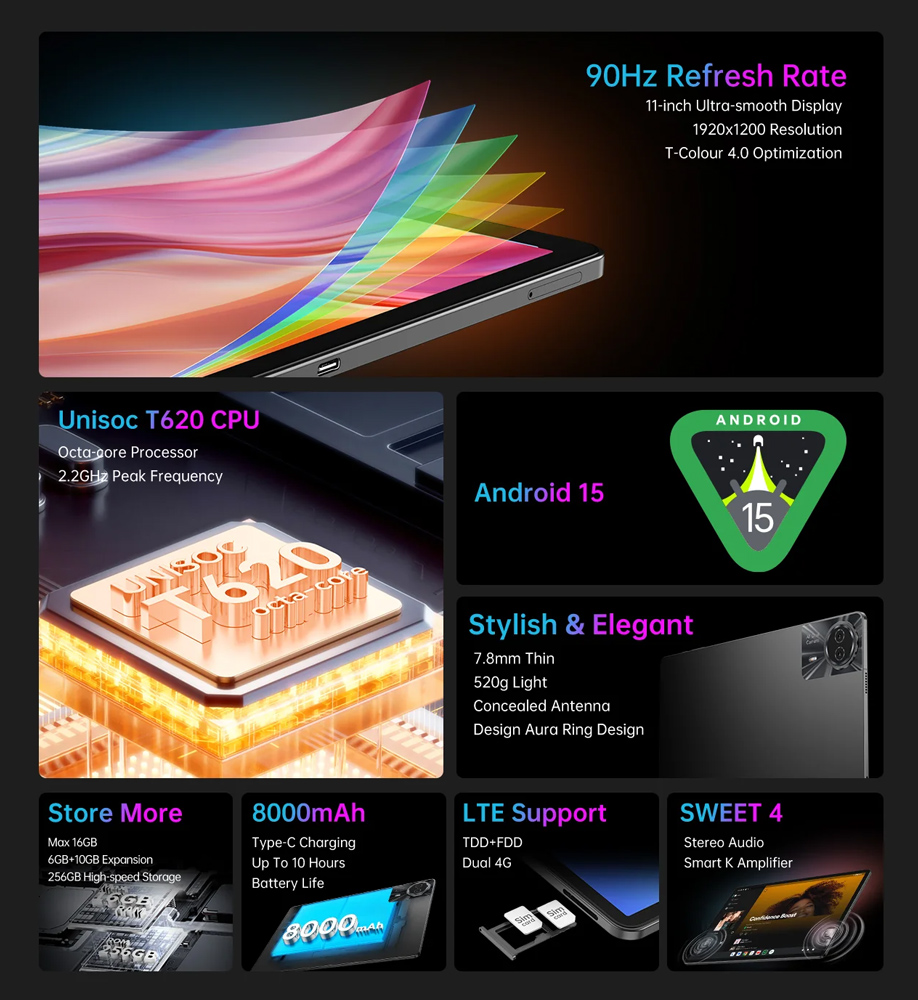TECLAST tablet T50 Plus, 11", 6/256GB, 4G, Android 15, 8000mAh, γκρι