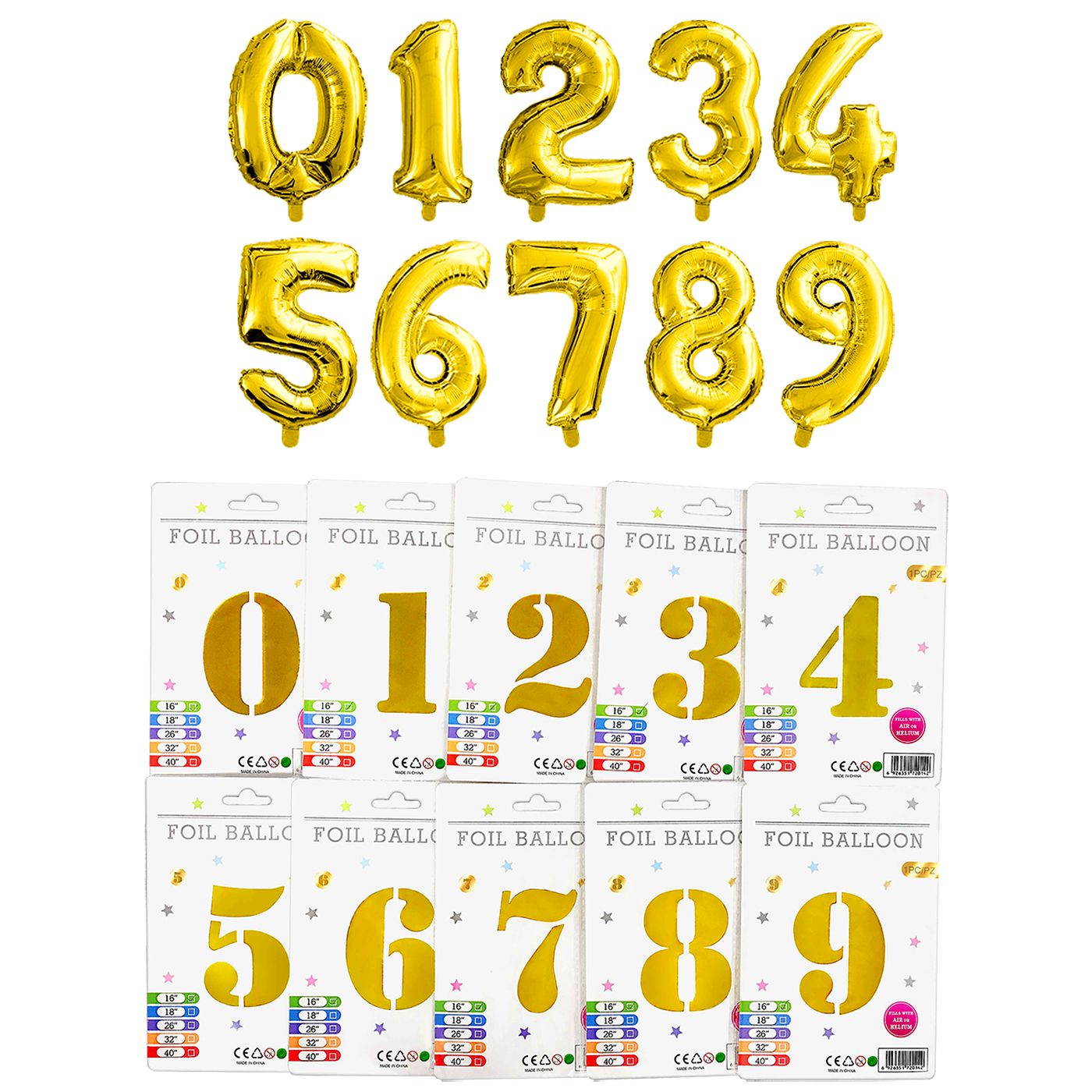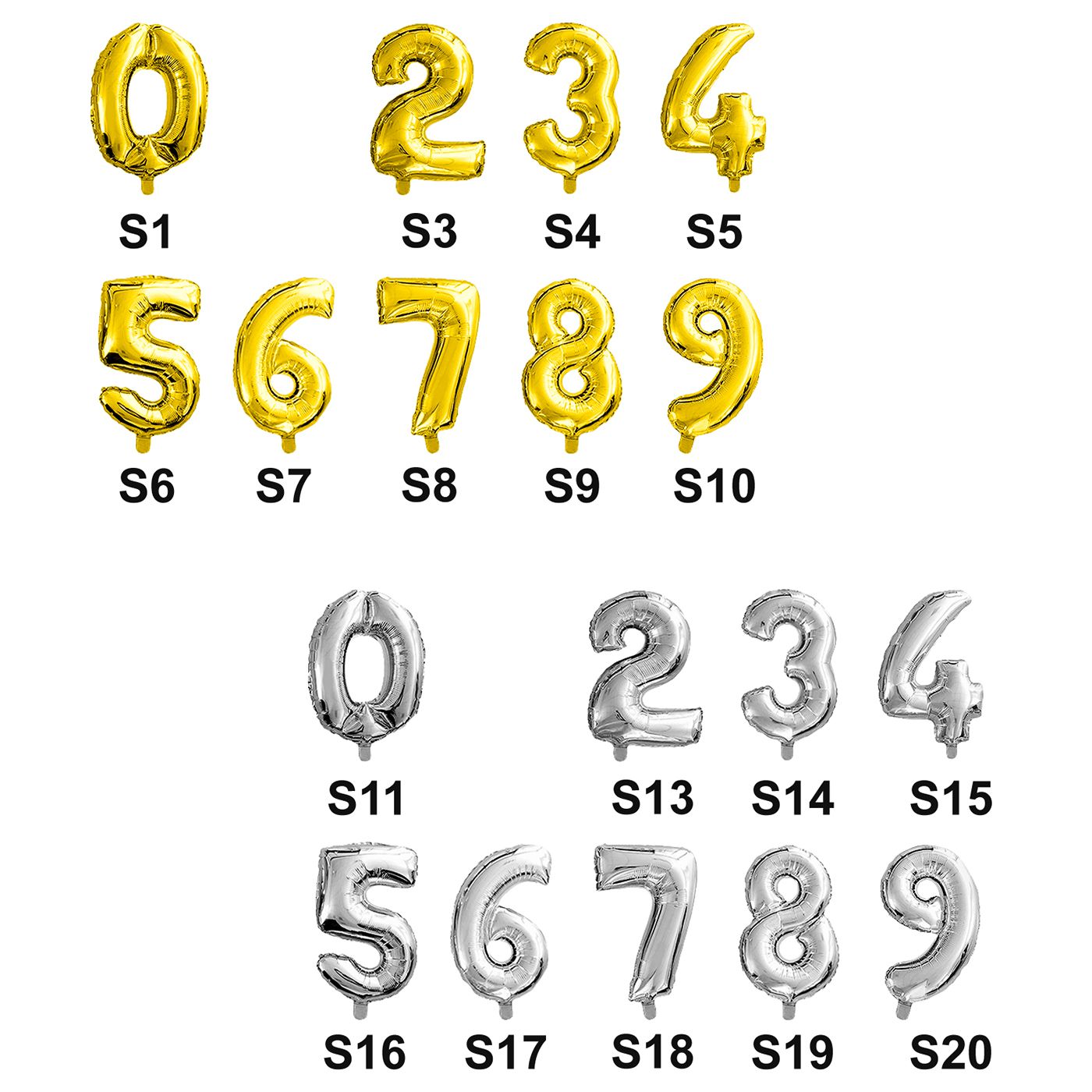 S1=0 χρυσό, S2=1 χρυσό, S3=2 χρυσό, S4=3 χρυσό, S5=4 χρυσό, S6=5 χρυσό, S7=6 χρυσό, S8=7 χρυσό, S9=8 χρυσό, S10=9 χρυσό, S11=0 ασημί, S12=1 ασημί, S13=2 ασημί, S14=3 ασημί, S15=4 ασημί, S16=5 ασημί, S17=6 ασημί, S18=7 ασημί, S19=8 ασημί, S20=9 ασημί. Αυτό το μέγεθος αν το γεμίσετε με ήλιον πετάει ! Αριθμός=102cm (40'')