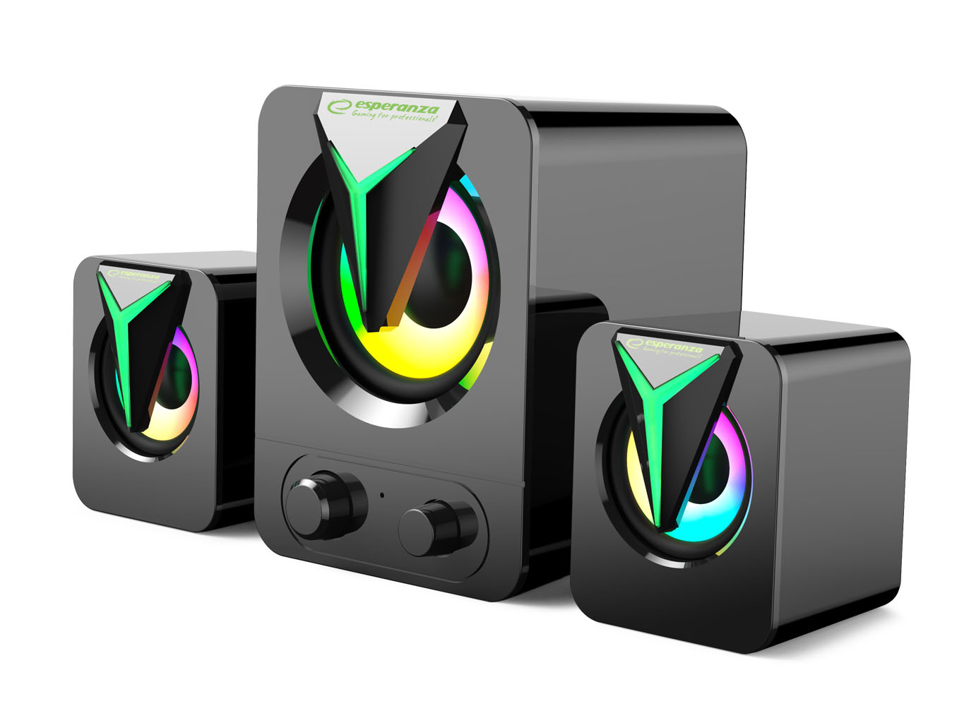 High-quality LED RAINBOW illuminated stereo speakers for notebooks and desktops.. They provide clear and natural sound quality. They work well with all computer units with speaker and USB outputs. They are equipped with built-in volume control. High-quality materials used for their manufacture protect against static electricity and electromagnetic interference.