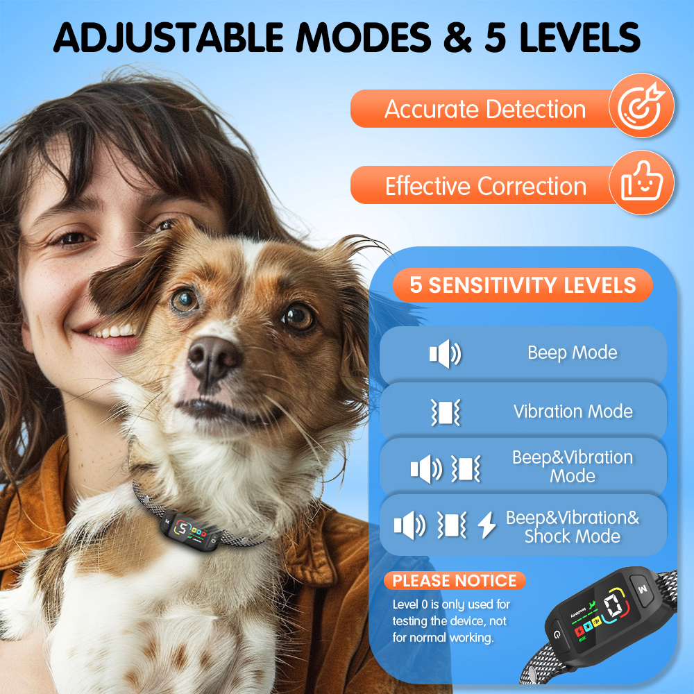 Με 4 λειτουργίες (ήχος, δόνηση, ήχος/δόνηση, ήχος/δόνηση/ηλεκτρικός παλμός) και 5 επίπεδα ευαισθησίας, μπορείτε να προσαρμόσετε τη χρήση του κολάρου ανάλογα με τις ανάγκες σας.