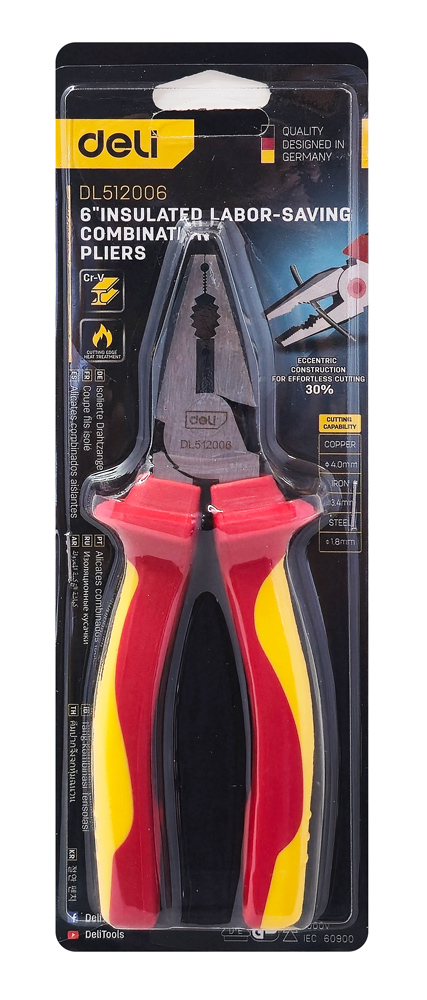 DELI πένσα ηλεκτρολόγου DL512006 με αντιολισθητικές λαβές, VDE 1000V, 160mm