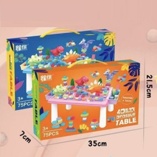 Τα νήπια μπορούν να χτίσουν την πόλη των δεινοσαύρων τους εν κινήσει και να στοιβάζουν τα τουβλάκια στα πλαϊνά δοχεία του τραπεζιού.