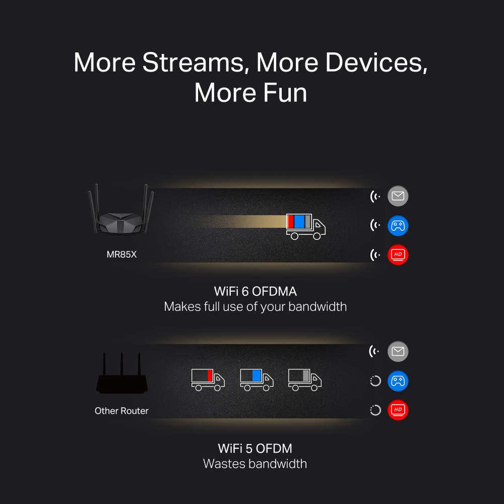 Περισσότερες συνδεδεμένες συσκευές: Οι τεχνολογίες OFDMA και MU-MIMO επιτρέπουν την ταυτόχρονη μετάδοση δεδομένων από και προς πολλές συσκευές, βελτιώνοντας τη συνολική απόδοση του δικτύου.