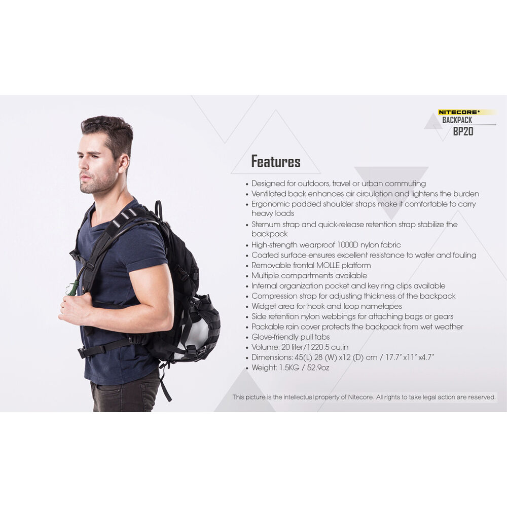 Τεχνικά Χαρακτηριστικά Υλικό: Νάιλον Ύψος: 450 mm Βάθος: 120 mm Πλάτος: 280 mm Βάρος: 1.500 g Χρώμα: Μαύρο Τύπος: Σακίδιο πλάτης Χωρητικότητα: 20L Αριθμός διαμερισμάτων: 6