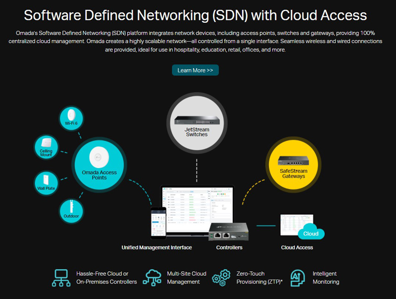 Μέσω της πλατφόρμας Network Defined Networking (SDN) της Omada, ενσωματώνει συσκευές δικτύου, συμπεριλαμβανομένων access points, switches και gateways, παρέχοντας σας 100% κεντρική διαχείριση cloud.