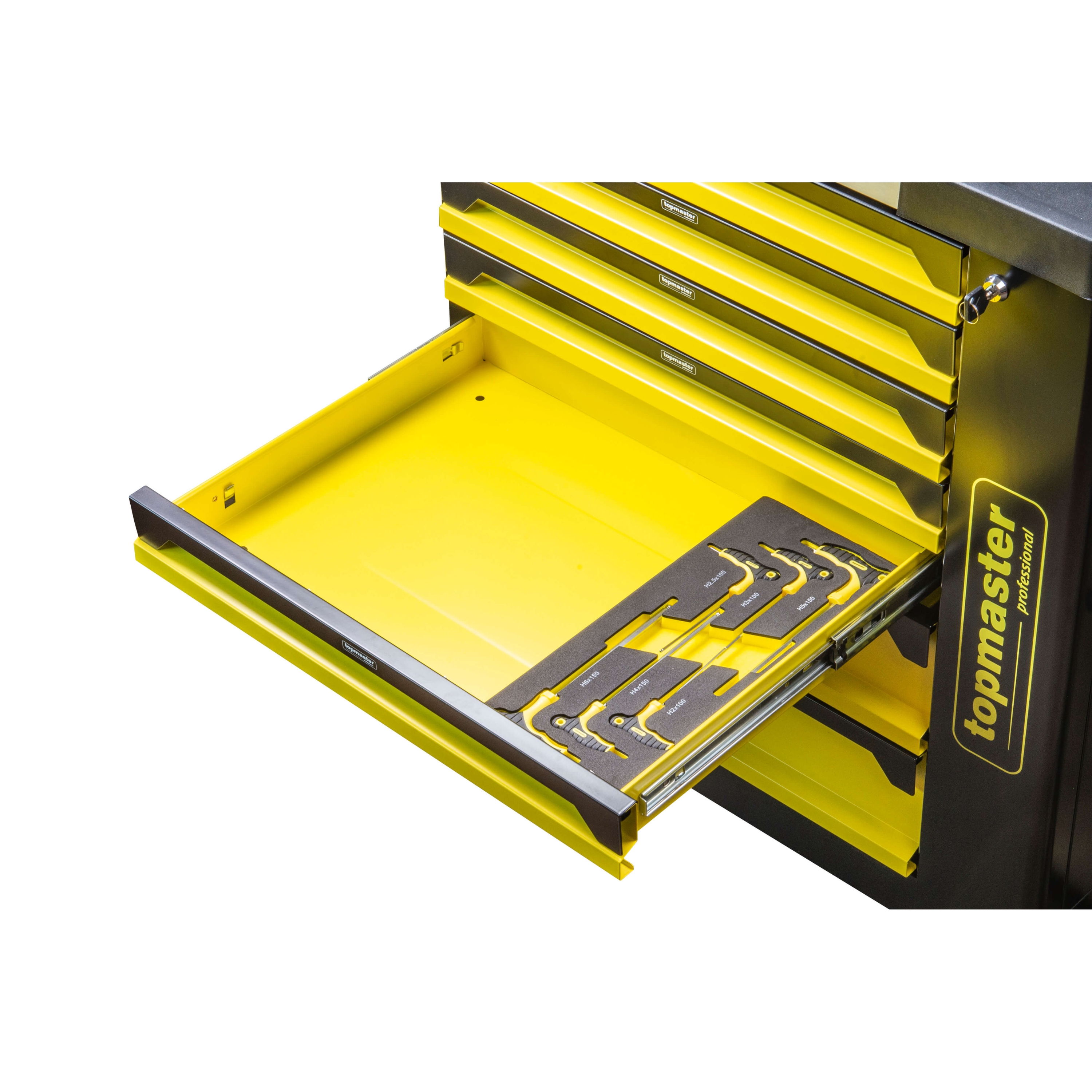 Ο τροχήλατος εργαλειοφόρος TOP MASTER με 7 συρτάρια είναι ιδανικός για επαγγελματίες. Διαθέτει στιβαρή μεταλλική κατασκευή, 550kg αντοχή και 182 εξαρτήματα. Έχει κεντρικό κλείδωμα, μηχανισμό αποτροπής τυχαίου ανοίγματος, εργονομική λαβή και ροδάκια PVC/PP. Η ανοξείδωτη επιφάνεια με 5 θήκες και η πλαϊνή πόρτα προσφέρουν επιπλέον αποθήκευση.