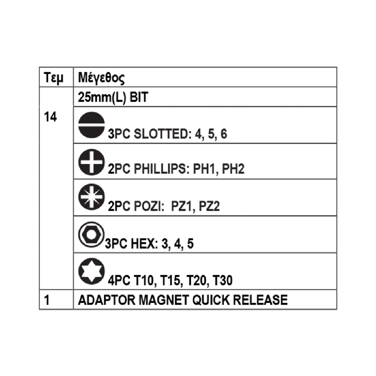 Τύπος: 44287Τεμάχια ανά σετ: 15.Μαγνήτης: 1Μέγεθος σπειρώματος: 1/4"Υλικό: Cr-VΜέγεθος: 1/4"