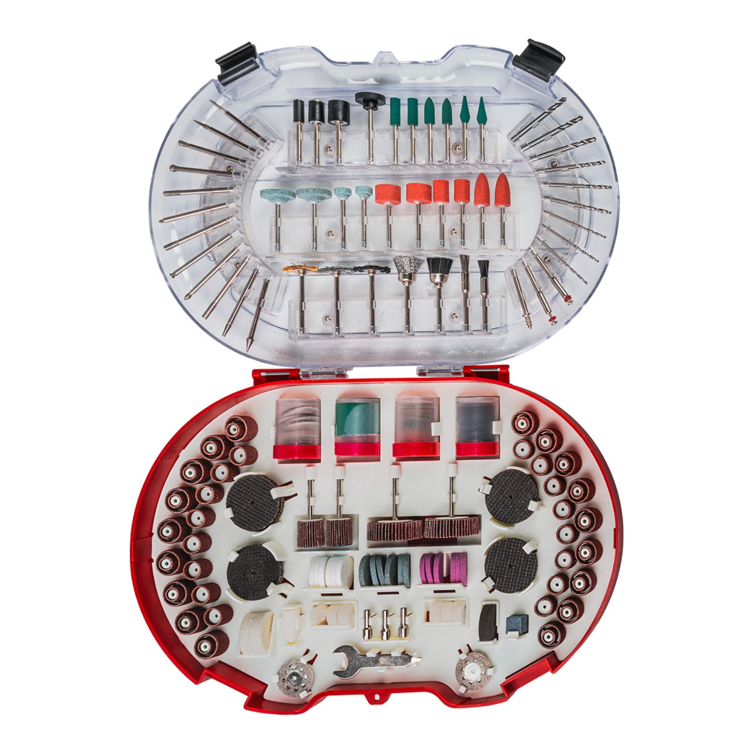 Περιλαμβάνει λειαντικές πέτρες και δίσκους λείανσης για διαμόρφωση και φινίρισμα επιφανειών, μύτες χαρακτικής για λεπτομερείς εφαρμογές σε ξύλο, μέταλλο και γυαλί, δίσκους κοπής για μέταλλο, ξύλο και πλαστικό για ακριβή κοπή, τροχούς στίλβωσης για φινίρισμα και λάμψη, συρμάτινες βούρτσες για αποτελεσματικό καθαρισμό επιφανειών και ιμάντες λείανσης σε διάφορα μεγέθη και κόκκους για μεγαλύτερη ευελιξία. Το σύνολο είναι άριστα οργανωμένο σε μία κασετίνα διευκολύνοντας τη χρήση και αποθήκευση.