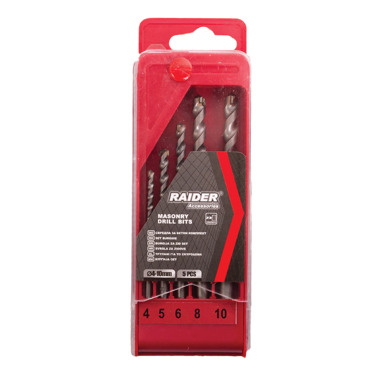 Το σετ τρυπανιών μπετού της Raider περιλαμβάνει πέντε τρυπάνια σε διαφορετικές διαμέτρους (4mm έως 10mm), κατάλληλα για εργασίες διάτρησης σε μπετό. Η κυλινδρική λαβή εξασφαλίζει άνετη και εύκολη χρήση κατά τη διάρκεια των εργασιών.