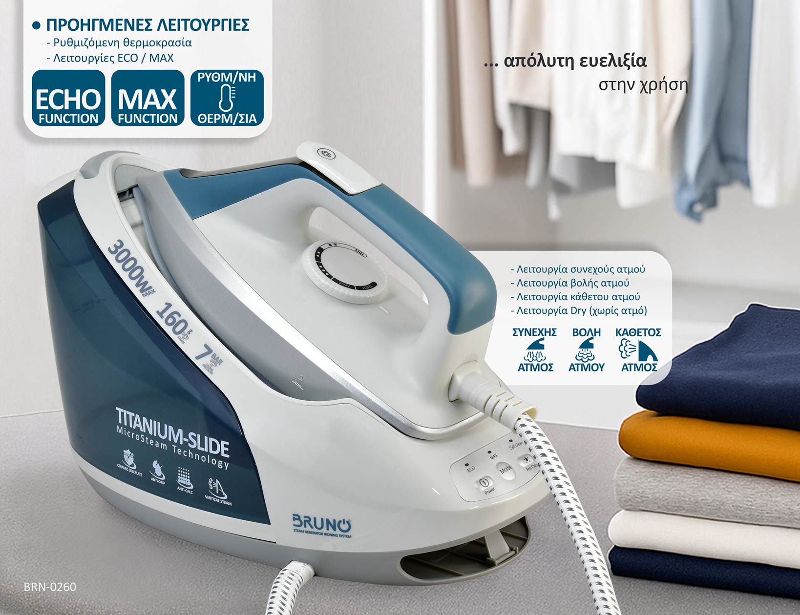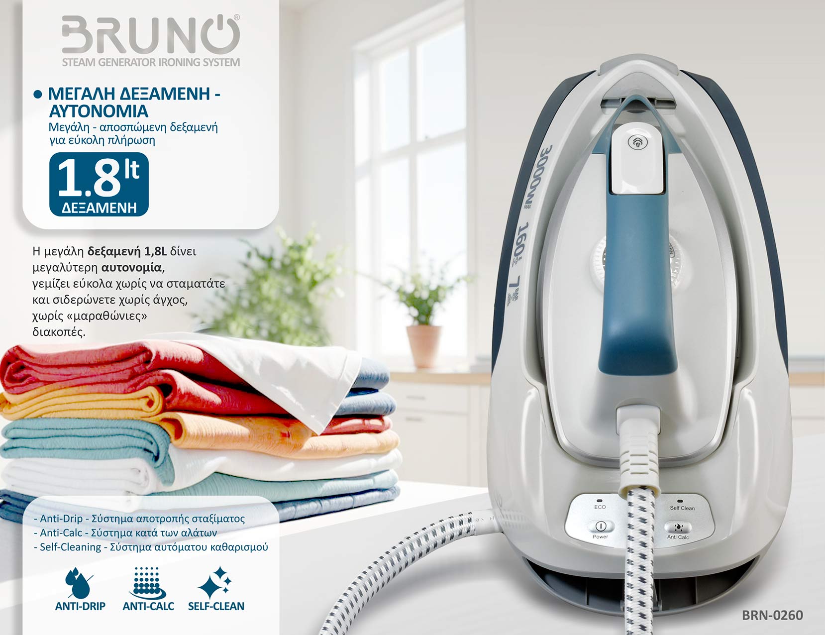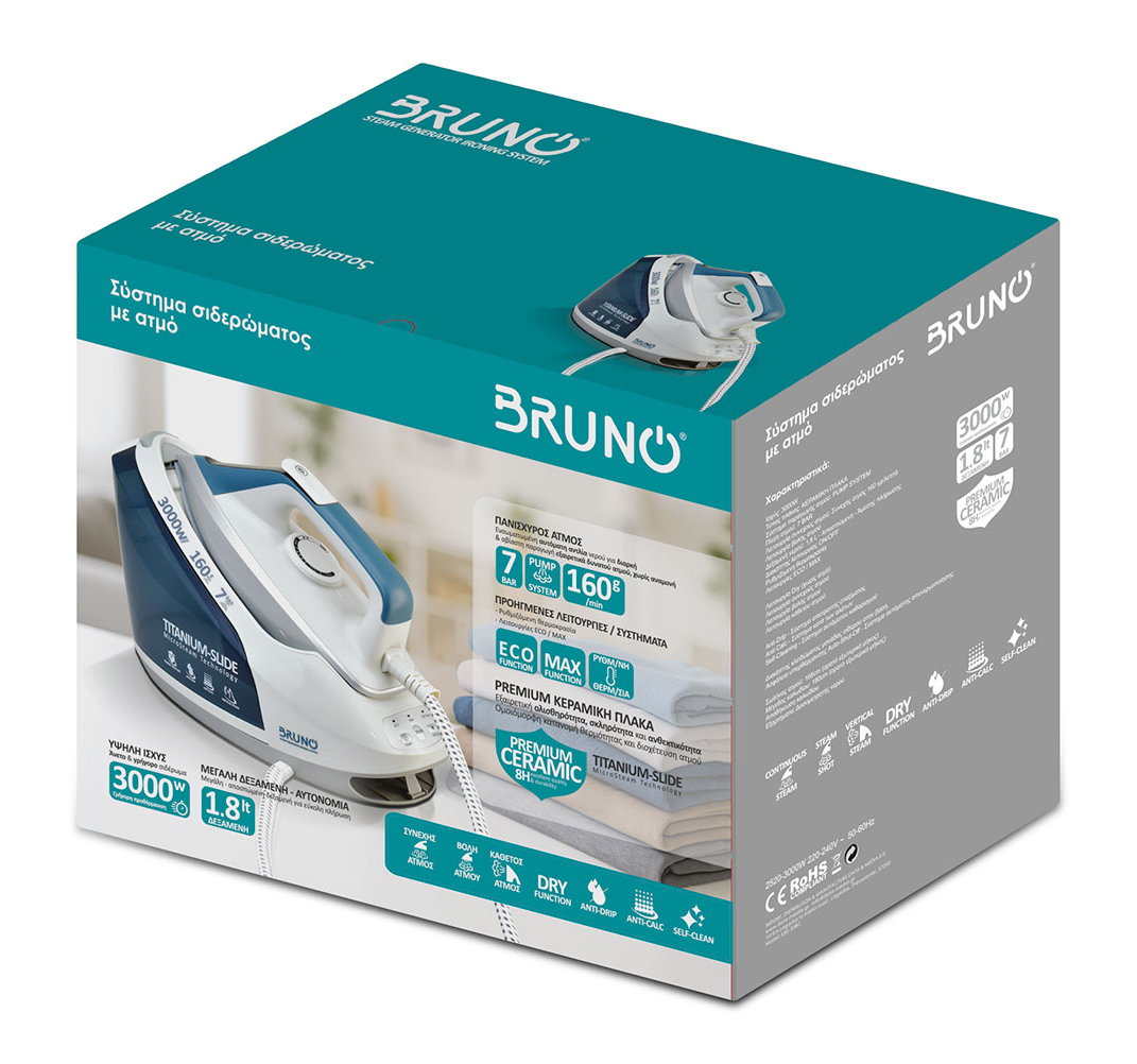 Το Σύστημα σιδερώματος BRUNO BRN-0260 υπόσχεται άψογο σιδέρωμα με λιγότερα περάσματα σε χρόνο...