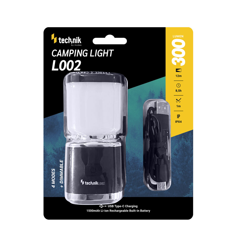 Η λάμπα camping Technik L002 παρέχει έως 300 lumens φωτεινότητας και διανέμει το φως 360°, εξασφαλίζοντας ομοιόμορφο φωτισμό γύρω της. Στις λευκές λειτουργίες, η φωτεινότητα μπορεί να ρυθμιστεί ομαλά από 45 έως 300 lumens κρατώντας πατημένο το πλήκτρο ελέγχου.
