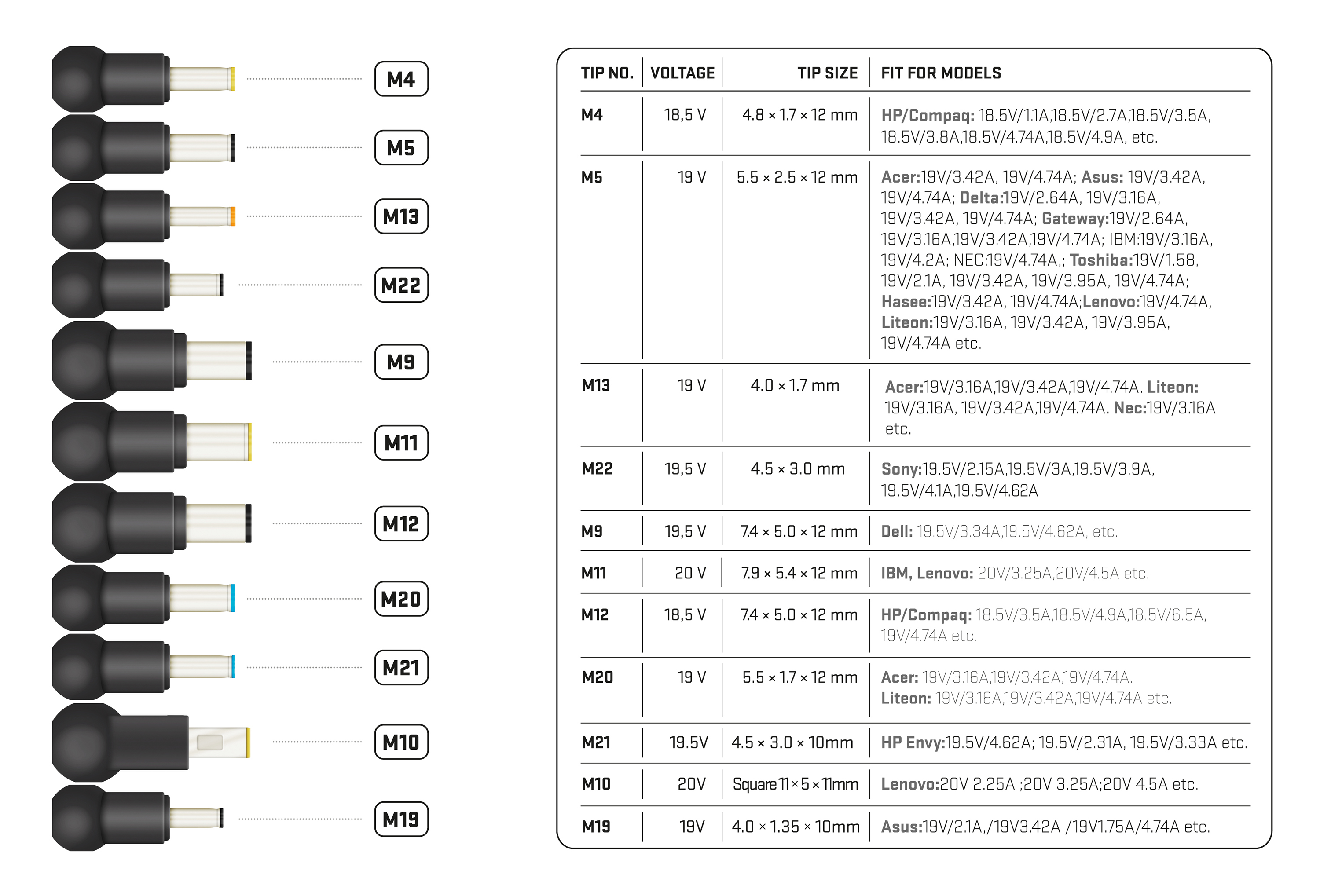 Ο universal φορτιστής για φορητούς υπολογιστές είναι κατάλληλος για τα περισσότερα εμπορικά διαθέσιμα μοντέλα χάρη στο σύνολο των 11 αποσπώμενων βυσμάτων.