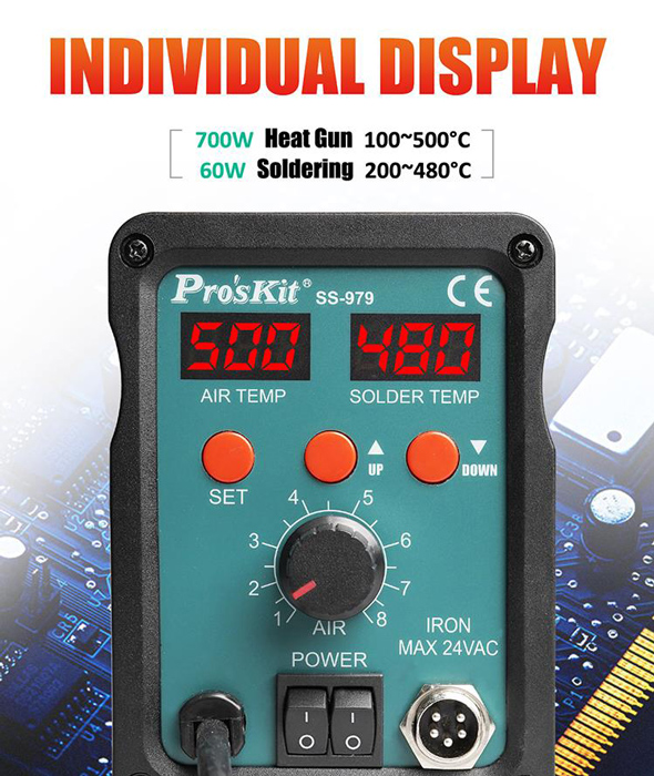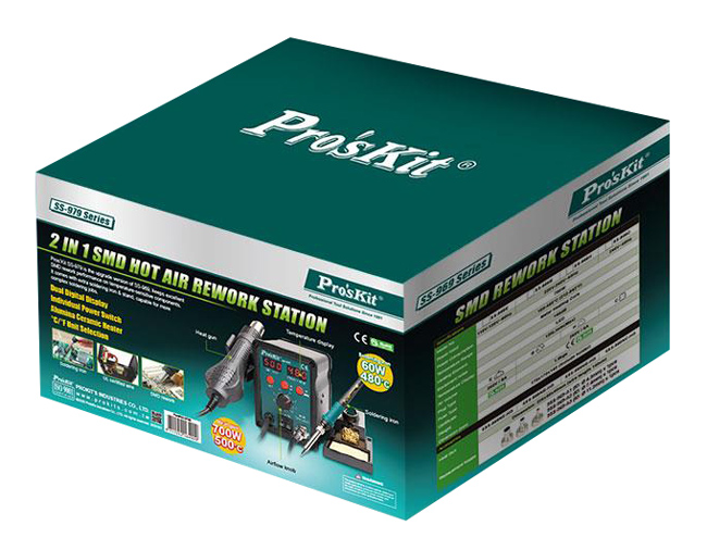 Σταθμός συγκόλλησης 2 σε 1 της PROSKIT με κολλητήρι και πιστόλι θερμού αέρα. Διαθέτει συνολική ισχύ 760W και ρυθμιζόμενη θερμοκρασία από 200 έως 480 °C για την συγκόλληση και 100 έως 500 °C για το πιστόλι θερμού αέρα.