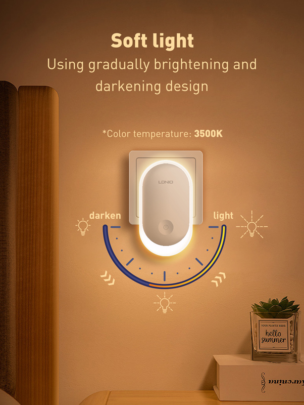 Φωτιστικό νυκτός της LDNIO με αισθητήρα φωτός για την αυτόματη ενεργοποίηση του φωτιστικού όταν βραδιάζει. Διαθέτει πολυλειτουργικό διακόπτη για την ρύθμιση της φωτεινότητας και εναλλαγή λειτουργίας (light sensitive mode, light off mode).