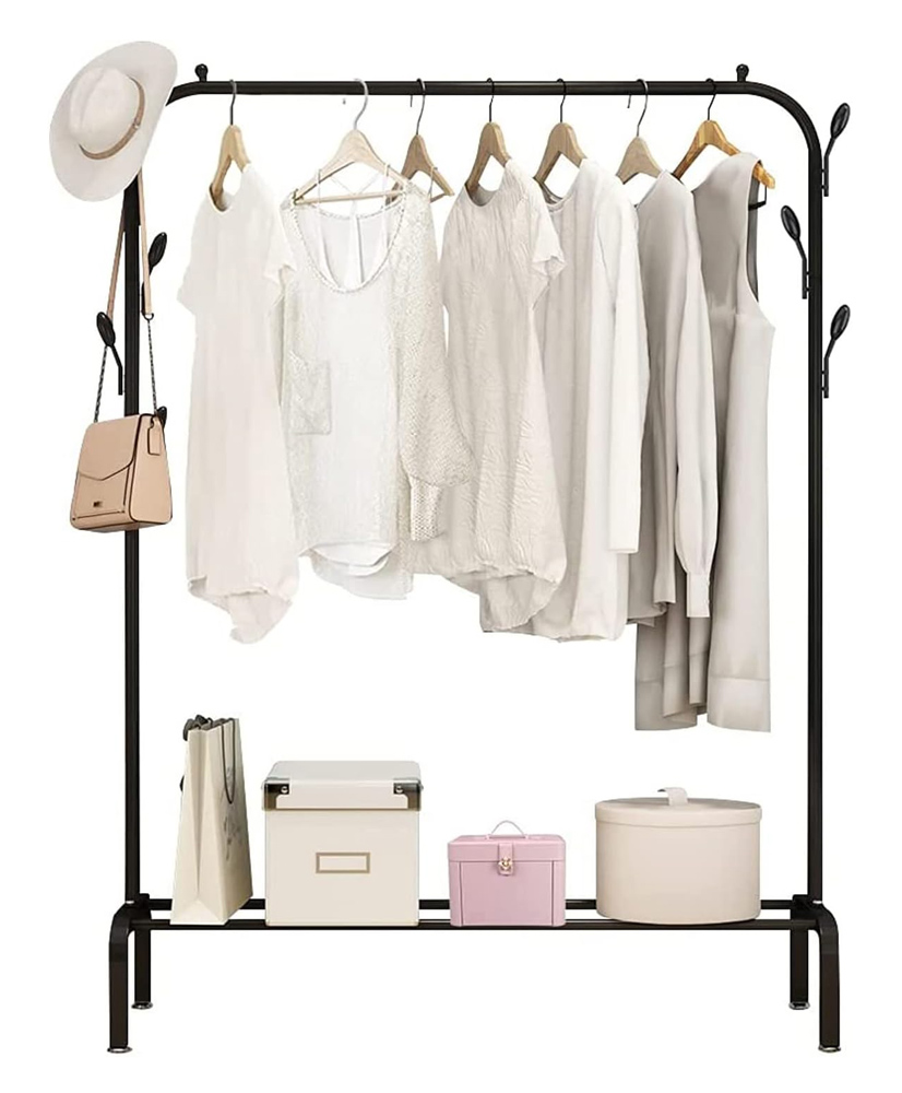 Κρεμάστρα δαπέδου για την αποθήκευση και οργάνωση ρούχων και άλλων προσωπικών αντικειμένων. Διαθέτει μεταλλικό συναρμολογούμενο σκελετό και στο κάτω μέρος της προσφέρει χώρο για την αποθήκευση παπουτσιών.
