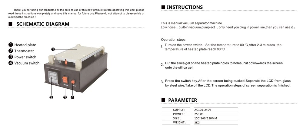 Το BST-B988 είναι ένα μηχάνημα για την αφαίρεση LCD οθονών για κινητά τηλέφωνα. To BST-B988 υιοθετεί την τεχνική του κενού αέρα,μέσω της αντλίας που έχει, κάτι το οποίο το κάνει ποιο εύκολο στην χρήση του από τις απλές συσκευές του εμπορίου καθότι δεν χρησιμοποιεί...