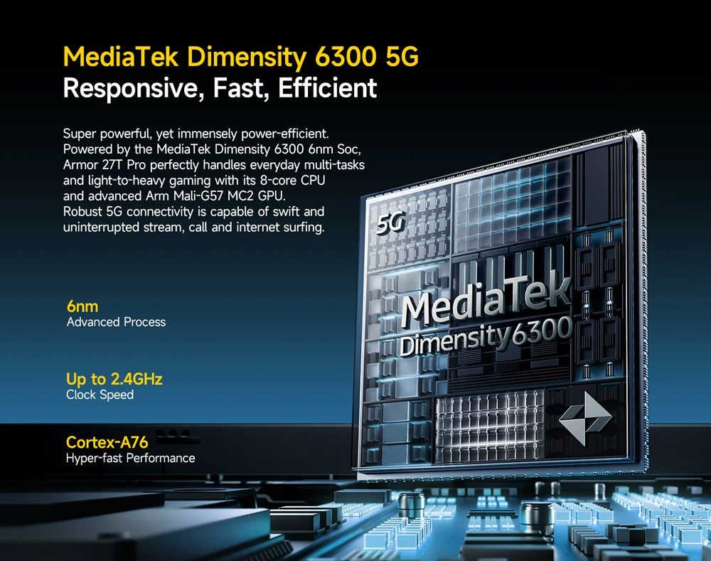 Με πιστοποίηση IP68/IP69K και πρότυπο MIL-STD-810H, το Armor 27T Pro είναι σχεδιασμένο για να αντέχει σε ακραίες συνθήκες χρήσης και περιβάλλοντα.