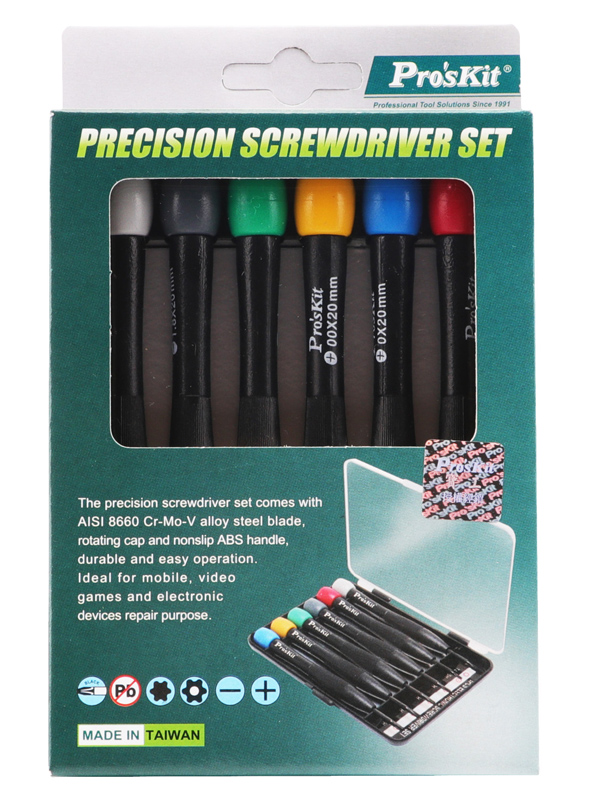 Σετ κατσαβιδιών της PROSKIT το οποίο αποτελείται από 6 κατσαβίδια ακριβείας. Είναι τοποθετημένα μέσα σε πλαστική θήκη, για την εύκολη τακτοποίηση και μεταφορά τους.