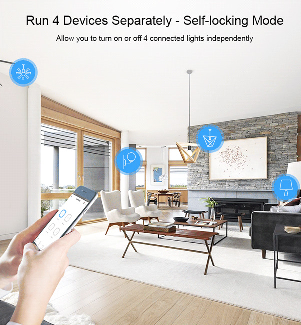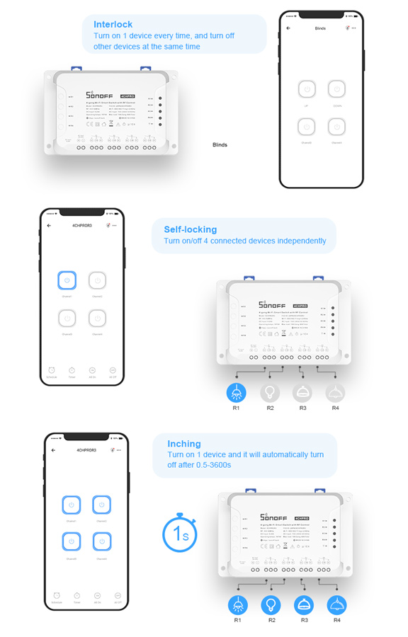 Το Sonoff 4CH R3 είναι ένας ασύρματος WiFi διακόπτης 4 καναλιών ο οποίος μπορεί να ελέγξει τέσσερεις οικιακές ηλεκτρικές συσκευές και υποστηρίζει την εναλλαγή μεταξύ 3 λειτουργικών τρόπων λειτουργίας: λειτουργία interlock/self-lock/inching. Αυτή η λειτουργία σας επιτρέπει να αφήσετε τον διακόπτη σας να ανάψει για λίγα δευτερόλεπτα, αλλά μετά σβήνει και λειτουργεί ως διακόπτης παλμών. Διαθέτει ενσωματωμένο δέκτη ραδιοσυχνοτήτων 433,92MHz RF, καθιστώντας δυνατό να ελέγχονται από το RF τηλεχειριστήριο. Οι χρήστες μπορούν να ενεργοποιήσουν/απενεργοποιήσουν από απόσταση τα συνδεδεμένα φώτα/συσκευές από την εφαρμογή eWeLink για iOS/Android ή με το 433MHz RF τηλεχειριστήριο. Μπορείτε να ενεργοποιήσετε χρονοδιακόπτες μονής/επανάληψης/αντίστροφης μέτρησης για αυτόματη ενεργοποίηση/απενεργοποίηση κατά την καθορισμένη ώρα. Οι χρονομετρητές μπορούν και λειτουργούν ακόμα και όταν το δίκτυο δεν είναι διαθέσιμο. Για να μπορούν οι συσκευές να ελέγχονται από άλλους, οι χρήστες μπορούν απλώς να μοιράσουν τις συσκευές σε άλλους λογαριασμούς και να ενεργοποιήσουν το συγκεκριμένο χρονοδιακόπτη.